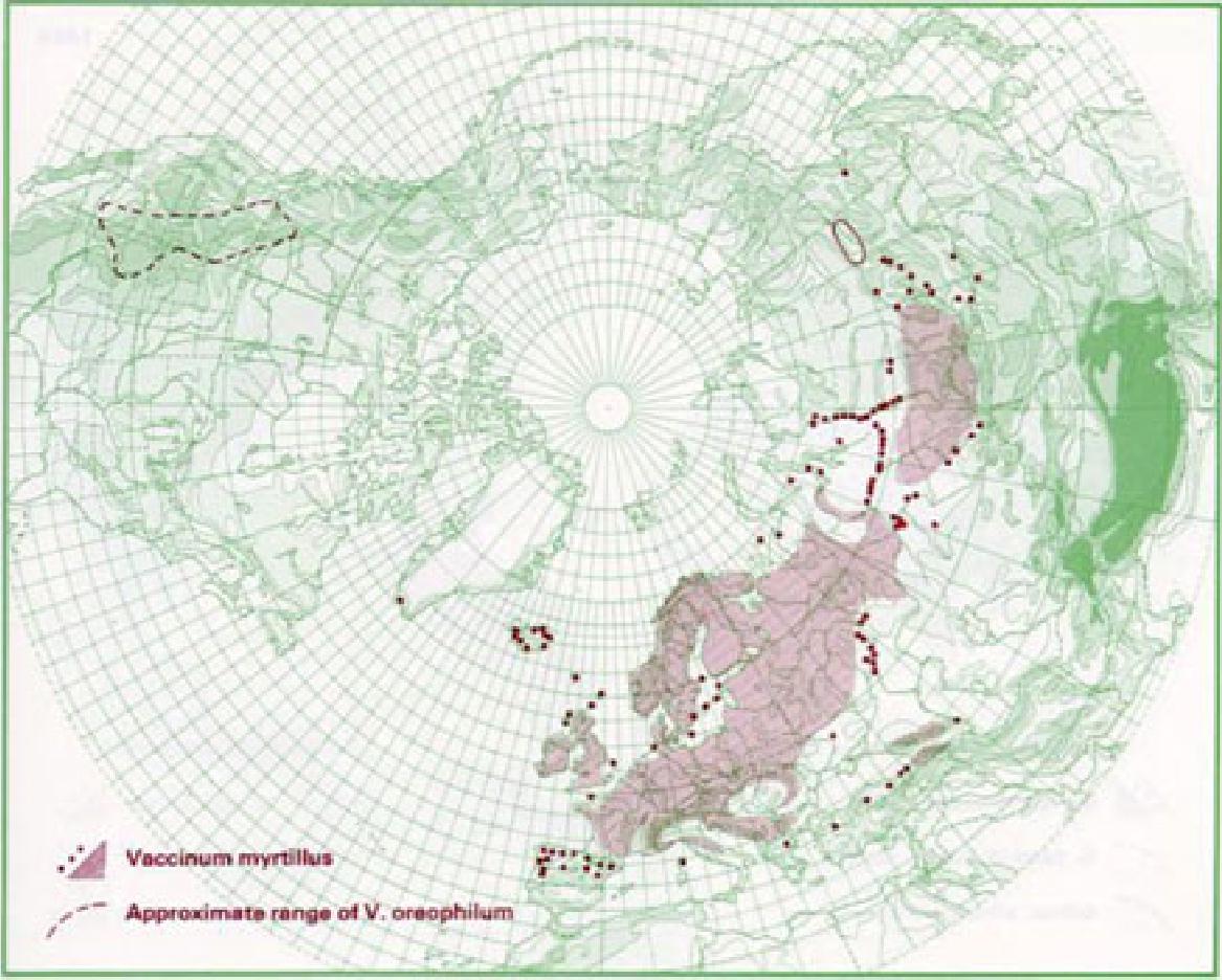 Distribution of European Bilberry in the Northen hemisphere (Hulten and Fries 1986).
