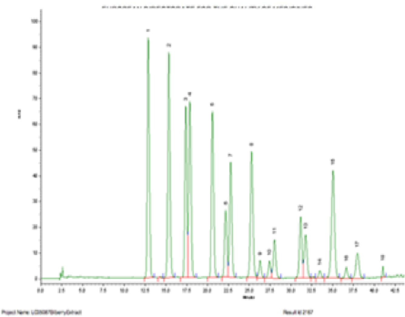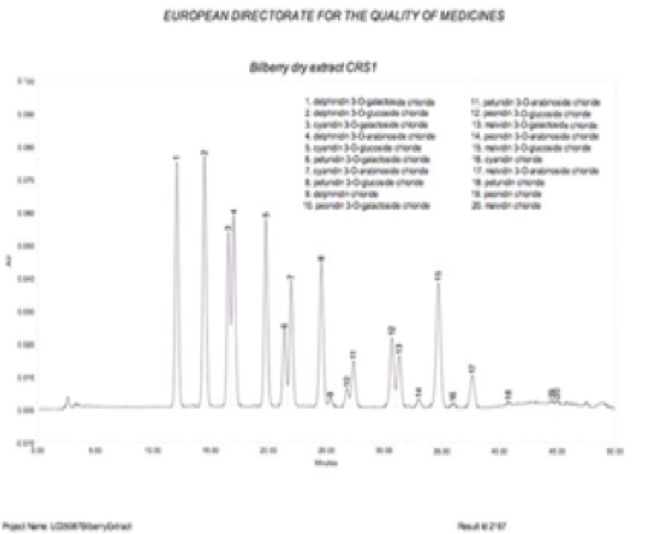 ビルベリーのHPLC分析結果は、15の主要なアントシアニン構成要素により特徴付けられているフィンガープリントを示します。