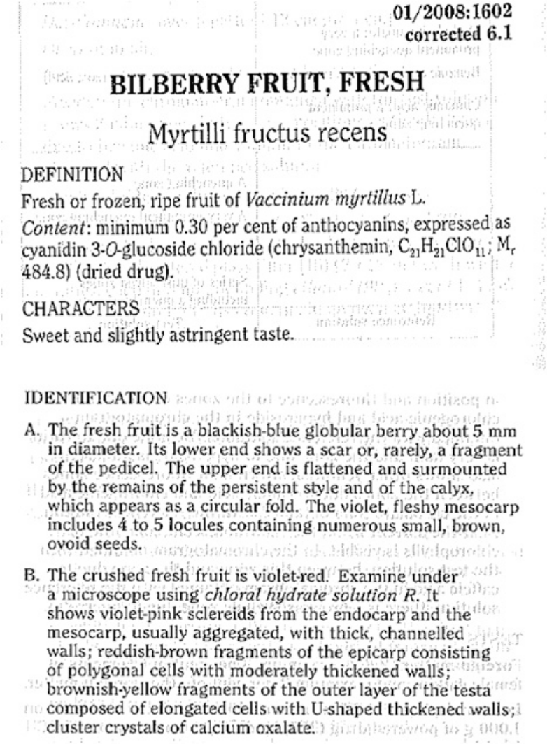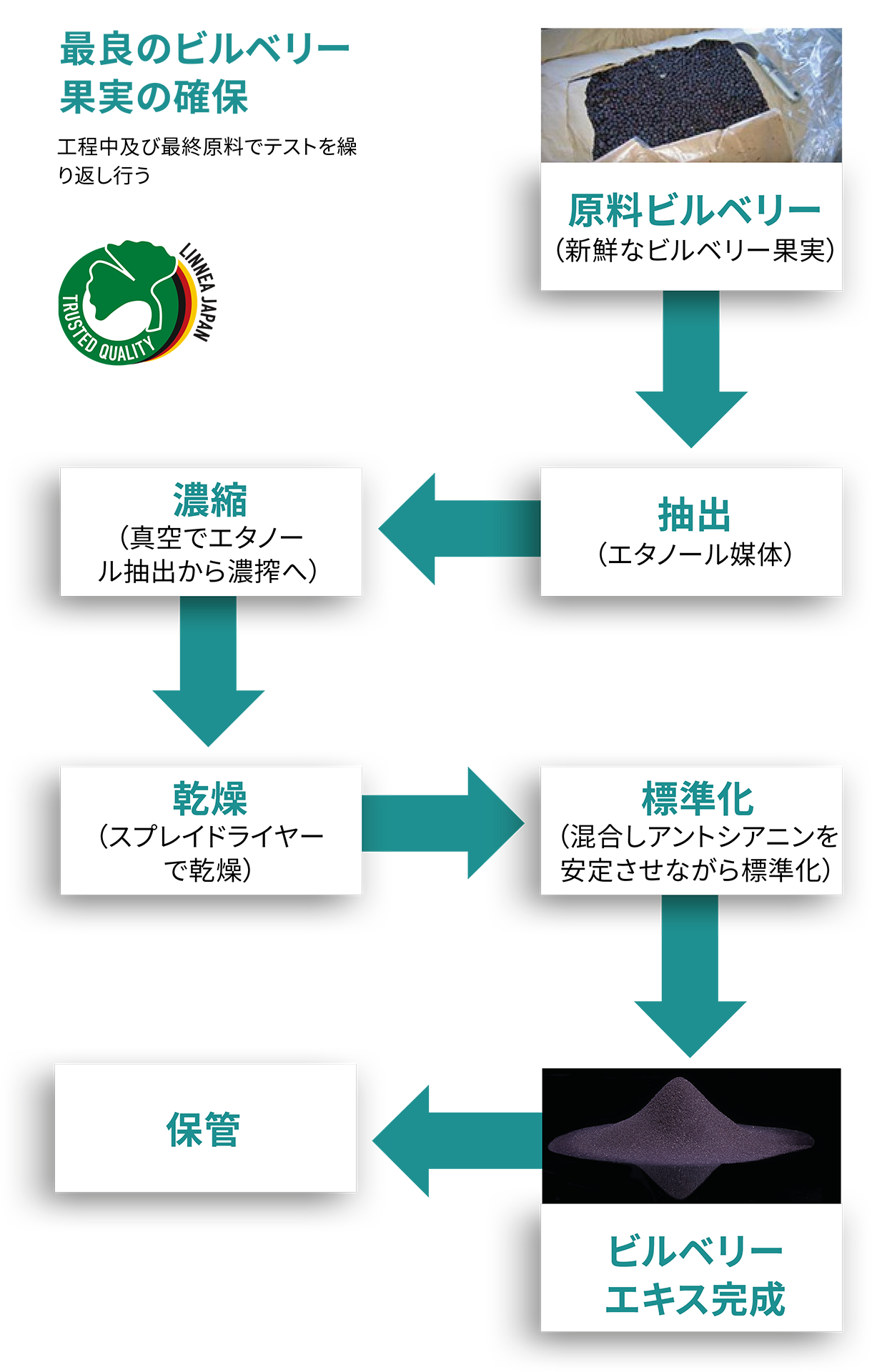 ビルベリー果実は、欧州薬局⽅に記載されている新鮮ビルベリー果実のモノグラフ(医薬品各条)を基準にテストを⾏い適合された果実のみを使⽤する。