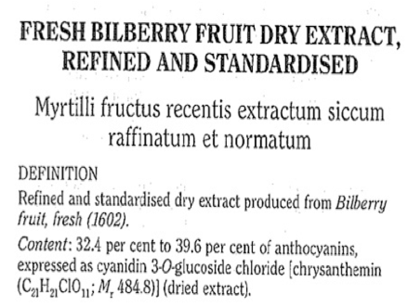 • 内容:ビルベリーエキスは、シアニジン3グルコシドおよび現在のヨーロッパ薬局方に従ってHPLC法にて測定されたアントシアニン(またはAnthocyanosides)32.4%-39.6%を含むように規格化される。