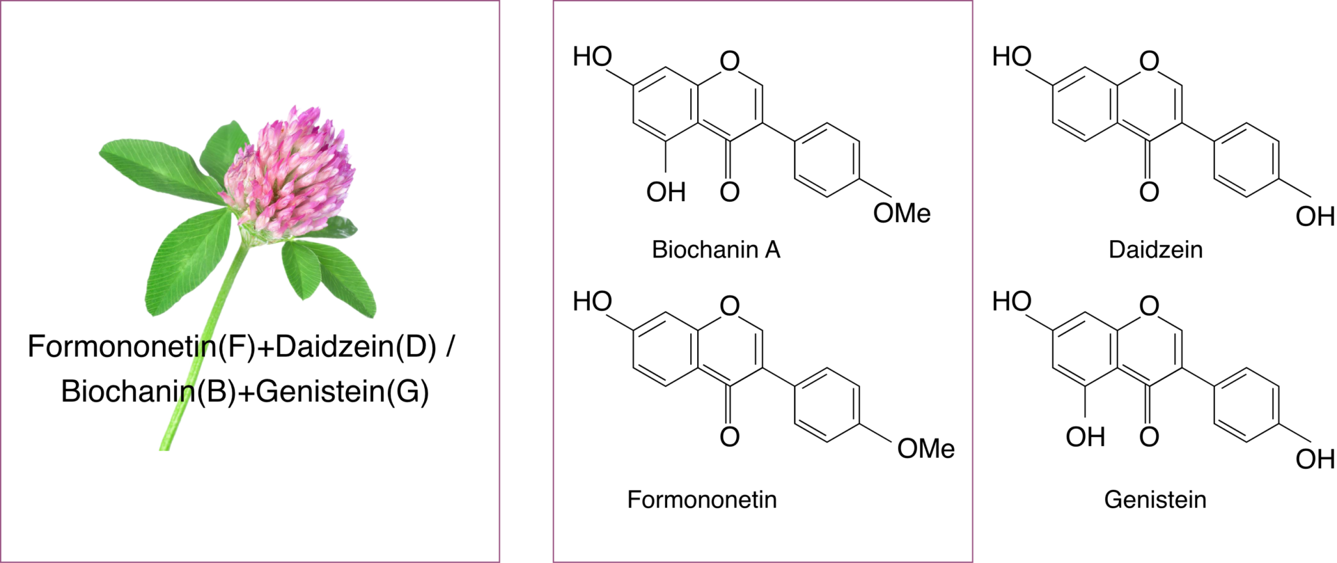 • バイオカニンとフォルモネチンはレッドクローバーイソフラボンの中の主要イソフラボンである。