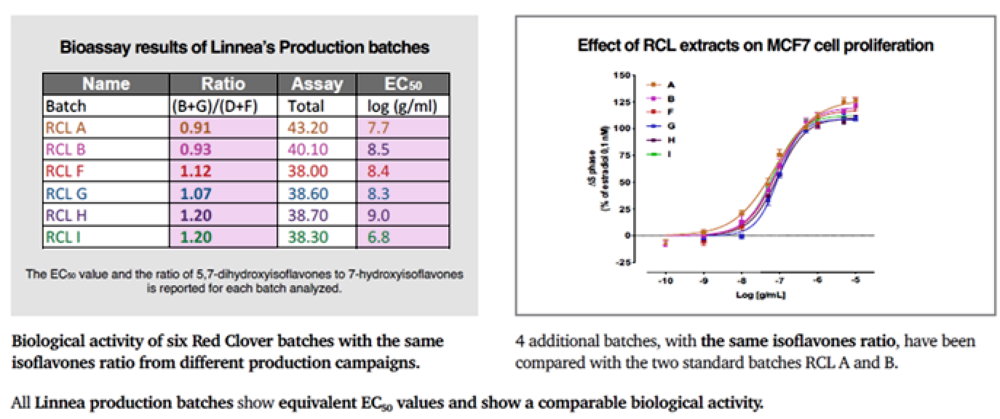 • リネア社レッドクローバーは、⽣体活性率の⾼いイソフラボン含有内容を正確に確認できるように管理⽣産された抽出エキスです。